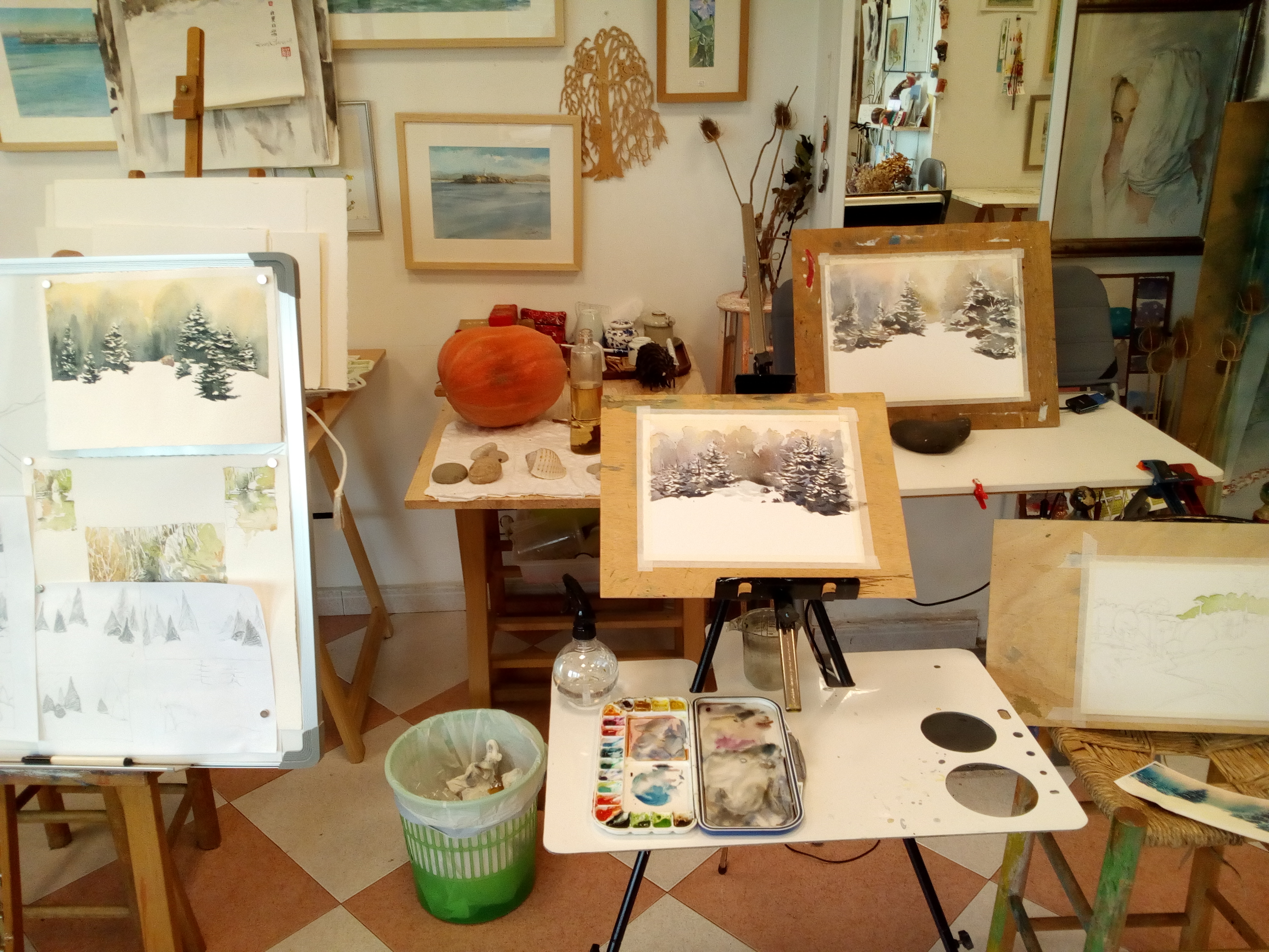 Muestra de acuarelas, oleos, dibujos, paisajes y personajes.